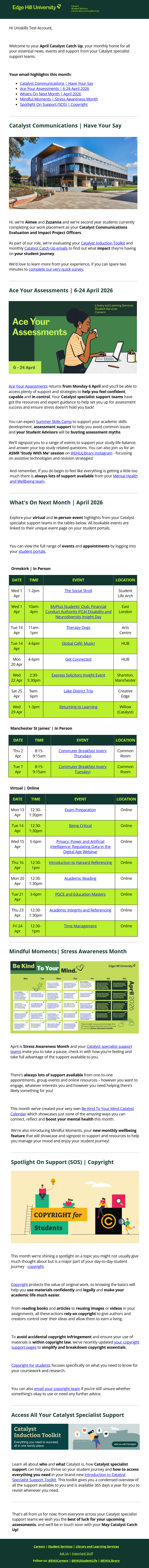 Catalyst Communications aims to keep you informed on all your essential news, events and support from Catalyst specialist support teams such as Money Advice, Mental Health and Wellbeing, UniSkills, Careers, Student Support and more via CatComms monthly emails.
